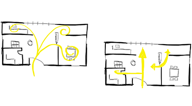 Durch eine funktional angepasste Raumaufteilung und eine gefällige Anordnung der Einrichtungsgegenstände wird der Energiefluss in den „Vier Wänden“ bewusst gelenkt und eine optimale Raumatmosphäre geschaffen. Hierbei spielen gefällige Formen, ansprechende Farben und passende Materialien eine große Rolle. Bereits vorhandene „starke“ Plätze werden für die einzelnen Bewohner in die Feng Shui-Arbeit mit einbezogen und genutzt.